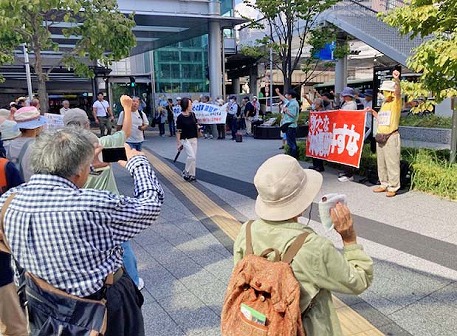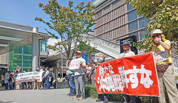 大阪では〈沖縄を再び戦場にさせない実行委員会(大阪・兵庫)〉の呼びかけで9月15日、JR大阪駅前広場(人民広場)に60人が集まり演習中止を求めるスタンディング・街頭宣伝をおこなった。今夏・今秋過程で、基地建設と軍事演習が引きも切らずおこなわれていることに、〈沖縄を再び戦場にさせない実行委員会(大阪・兵庫)〉では大きな怒りが巻き起こり行動を呼びかけた。
