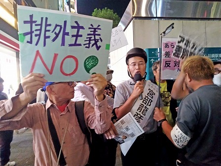 いつもは川崎駅頭でヘイトを追いやっている「川崎駅前読書会」、ジャーナリストの安田浩一さん、弁護士の師岡さんや神原さん、朝鮮学校の給食を支援するボランティアなども次々と思いをアピール。「在日コリアンの方、クルドの方など選挙権のない外国人に対して、選挙を利用しての差別排外主義攻撃などは絶対に許せないことです」。