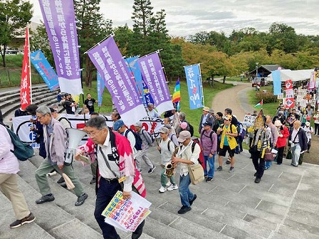 第3部ピースパレードは公園を反時計まわりで1周する約1・7qのコースだ。この時、会場周辺をまわっていた右翼の街宣車はいなくなっていた。プラカードを掲げた長い隊列が続き、会場を出るのに時間がかかる。周辺の住宅からは、家の前に出てきて手を振ってくれる人、2階窓から手を振る人もいた。