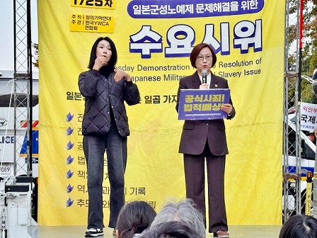 さらにはドイツまで行って『ベルリンの少女像を撤去せよ』と叫び、ヘイトデモを強行した。彼らは日本の極右団体と協力して韓日を往来し、日帝の不法植民地化、戦争犯罪、強制動員、性奴隷制などを全て否定するために組織的に活動する人々だ。」と弾劾していた。しかし、「今も世界のあちこちで怒りと共感、勇気と情熱で真実を掴んで立ちあがる『私たち』がいる。私たちの存在そのものが勝利のしるしであり、超国家的連帯の力が希望の灯りだ。1725回まで積み重ねられた水曜デモの莫大なエネルギーと蓄積された時間の力が、私たちの未来を変えるだろう」という熱いアピールだった。