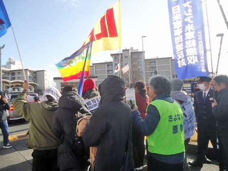 集会終了後、岩国市庁舎前広場に移動してミニ集会をひらき、そこから岩国基地ゲート前までデモをおこなった。ミニ集会では地元、関東、関西、沖縄、フィリピン他からのあいさつがあり、13時からデモに出発。「岩国基地はいらない」「FCLPをやめろ」「岩国にミサイルはいらない」などのコールの他、「守ろう愛宕山」の歌も歌いながらのデモである。米軍住宅フェンス前では「US troops OUT!」などの英語のコールもおこない、ゲート前では激しい抗議にもなった。およそ1時間余りのデモを貫徹。