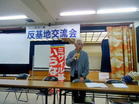 通常の「岩国行動」はここまでだが、今回はこの後オプション企画として福祉会館に戻り「愛宕山を守る会」の岡村寛さんからお話を聞く催しがあった(写真右)。岡村さんは愛宕山の牛野谷住民自治会で自治会長だった人。愛宕山には愛宕神社という神社があり、牛野谷の住民がそこをお守りしていた。その山を削って岩国基地の沖合展開(騒音軽減という岩国市民の悲願に答えるふりをした基地強化)をおこない、跡地に米軍の住宅を作る計画に地元は反対した。今も「1の日行動」として、毎月3回、遷座した神社の広場や集会場で集まりがもたれている。岡村さんは日米地位協定の問題や、岩国市の行政の問題について2時間ほど語られた。