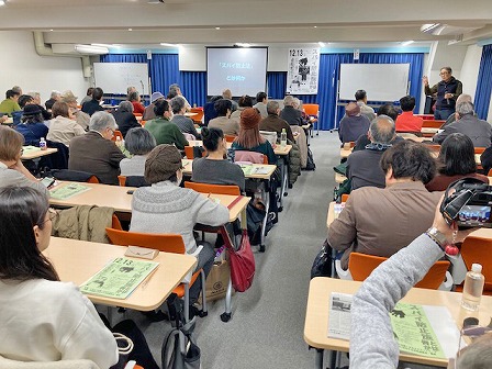 「労働者反戦交流集会」の後、17時半から「反基地交流会」がひらかれた。サード反対韓国ソソン里平和活動家の金永宰さんが、韓国で起こった尹錫悦による不法非常戒厳から1年経過しての反社会差別勢力との闘いや、現在のサード基地の現状を報告した。